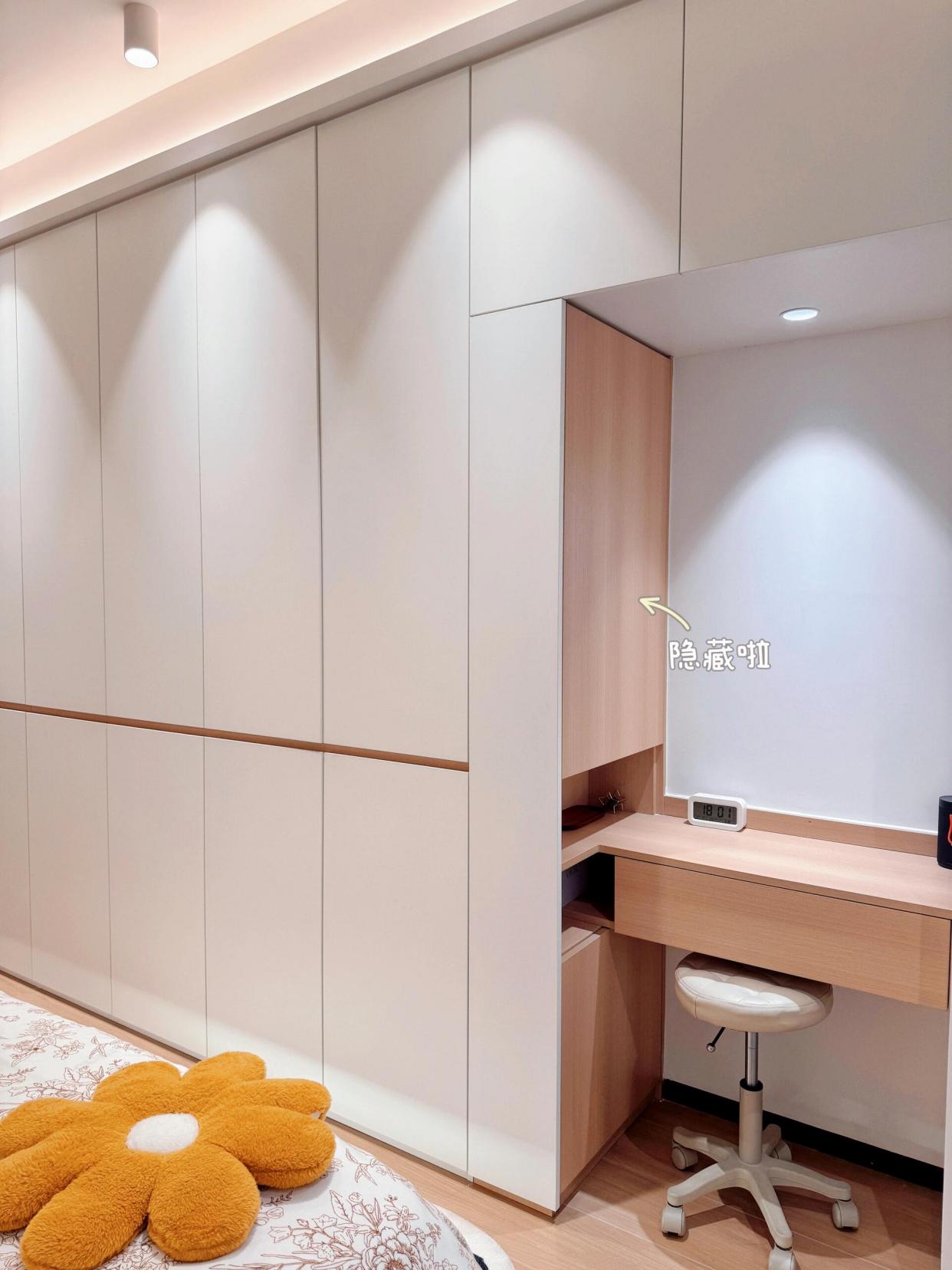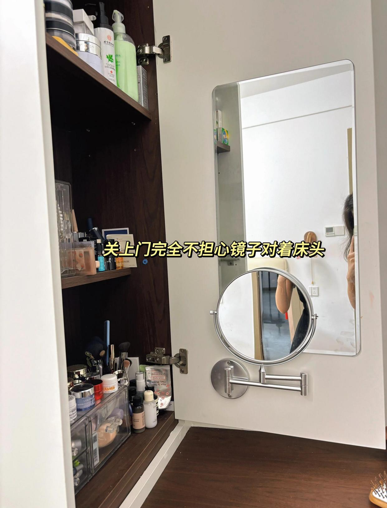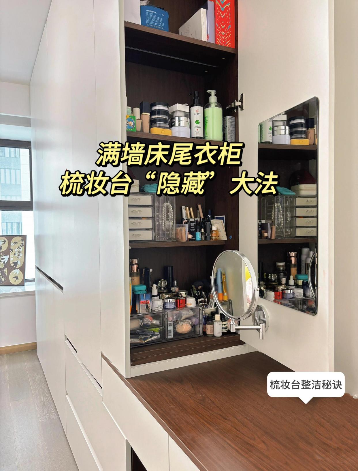 像网友@多西西的家,就是这样设计的,因为女主人不想面对梳妆台面上堆满的瓶瓶罐罐,看着乱糟糟,还很容易落灰,强迫症都要犯了。