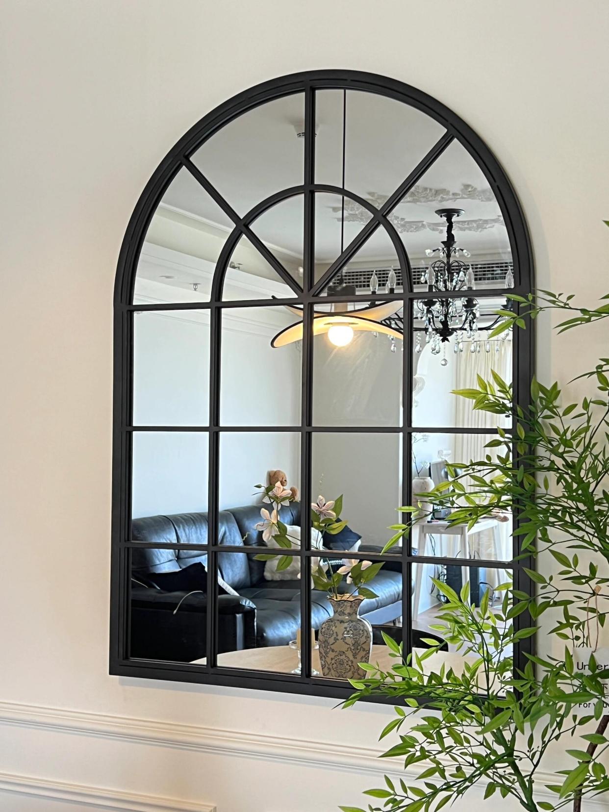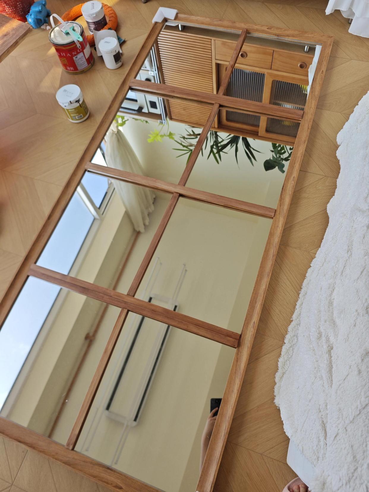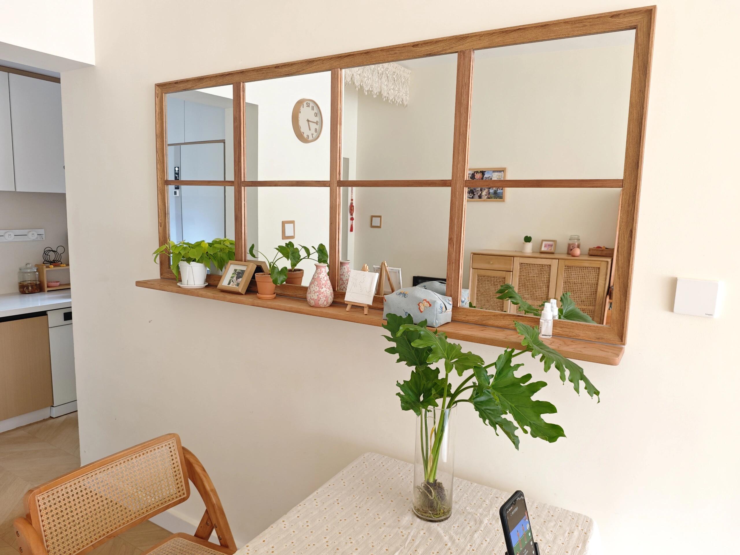 还有网友@羽毛 也在餐厅位置做了一面方形的假窗,做法也简单,先确定好尺寸,在网上下单镜子、木条、木蜡油、置物木板,等材料到齐后,刷漆安装就好了,自己就可DIY完成。