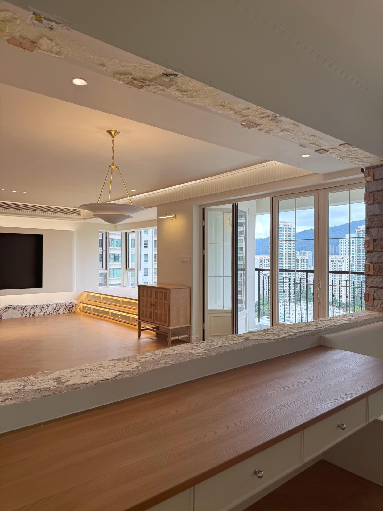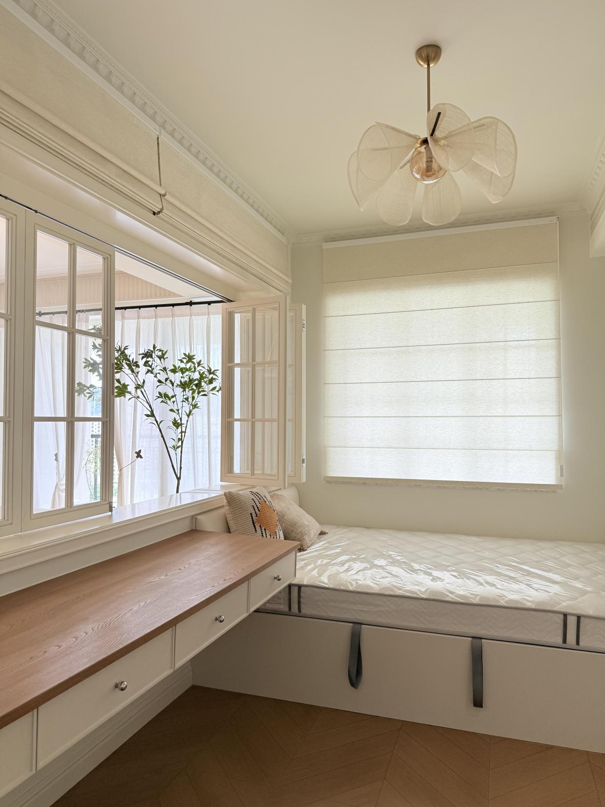 把非承重墙拆除一半后,上半部分改成折叠窗户,房间是书房也可以是卧室,打开窗户空间显通透,关上又是独立空间。