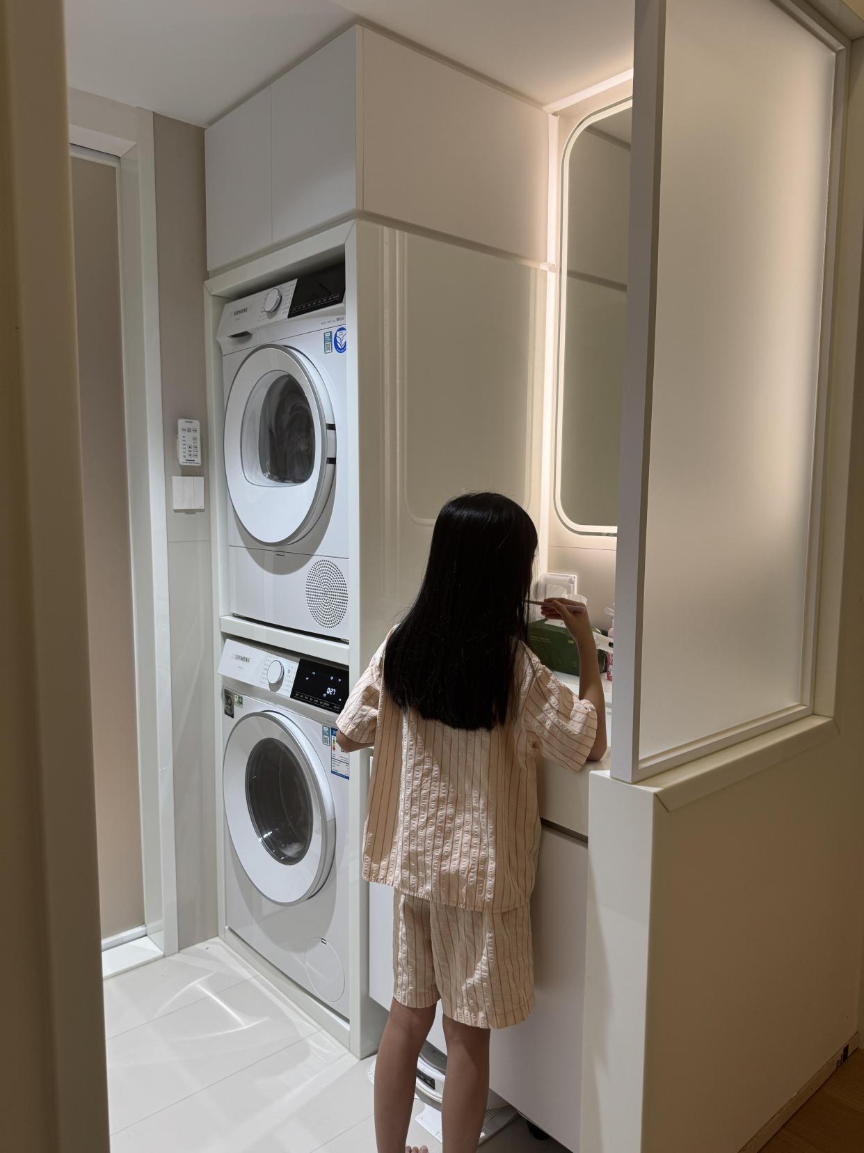 最友好的的洗护动线应该是在干湿分离的卫生间,这样洗澡、洗衣动线更近,洗完澡顺手就洗衣了,不用去阳台折返。