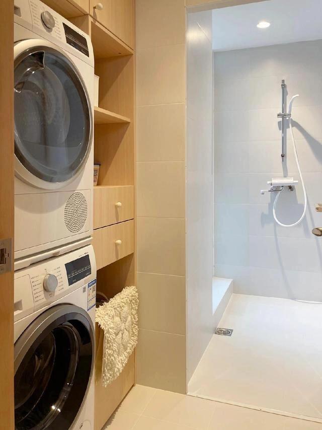 有条件的设计一个洗衣区放洗烘套装,洗衣机与柜子结合,洗衣柜收纳洗涤用品与杂物,一个脏衣篓放换下来的脏衣服。