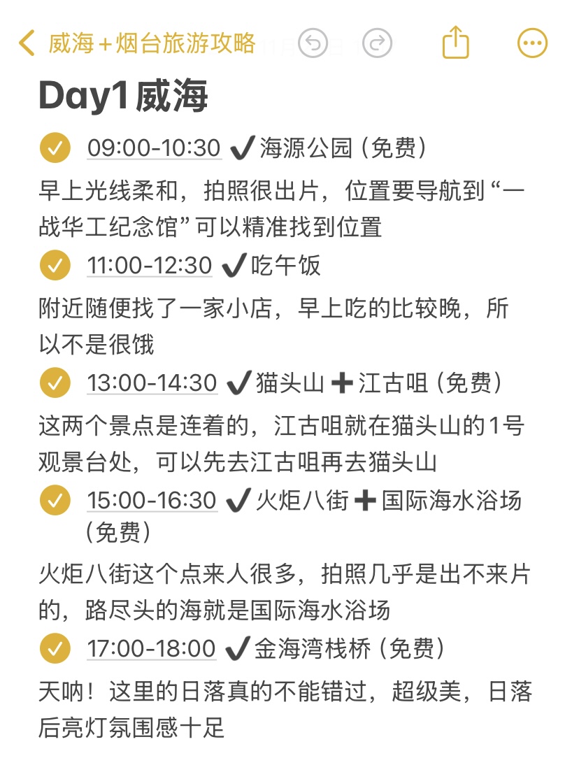 🥳我们先去的威海,威海距离烟台很近(只能到牟平站高铁20分钟,但是到烟台市区还得转车,人多的话建议搭顺风车🚗去!)