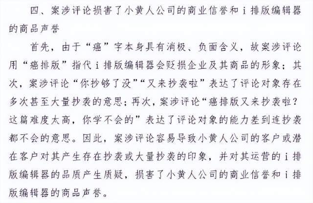 要点四:损害是如何发生的?法院最终认定,四零四公司的行为损害了小黄人公司的商业信誉和商品声誉。词语的贬损性: “癌”字本身带有强烈的负面和侮辱性含义,直接贬损了“i排版”的品牌形象。行为的暗示性: “抄够了没”“又来抄袭”等用语,暗示对方是惯犯,存在长期、大量的抄袭行为。能力的否定性: “这篇难度太高,你学不会的”这句话,更是在人格上暗示对方能力低下,连抄袭都抄不好。这些评论综合起来,足以让相关公众对“i排版”的产品质量和企业信誉产生严重质疑,从而构成实质性损害。