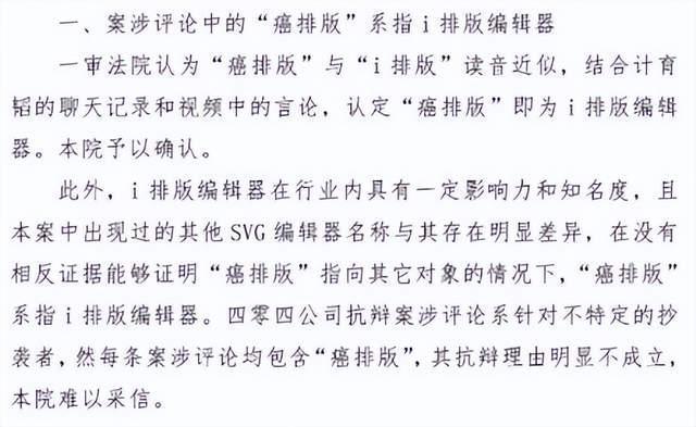 接下来,我们以科普的视角,为大家拆解法院判决背后的四大核心要点。要点一:攻击对象是谁?法院如何认定“癌排版”就是“i排版”?案件的起因是,四零四公司在其“E2编辑器”的图文效果前端源代码中,植入了“癌排版你抄够了没?”“癌排版又来抄袭啦?”等评论。被告方辩称: “癌排版”并非特指某一家,而是泛指行业内所有抄袭者。法院判决: 法院驳回了这一说法,并从两个层面认定“癌排版”就是指“i排版”:读音近似: “癌”(ái)与“i”的发音高度相似,这是最直观的联系。行业背景: 在微信编辑器领域,“i排版”具有较高的知名度。在没有证据指向其他对象的情况下,结合原告方提供的被告相关人员的聊天记录等证据,可以明确锁定攻击对象就是“i排版”。这个认定告诉我们,使用谐音、暗语或代号进行攻击,并不能规避法律责任。只要能通过常识和证据链形成指向,就能被法律认定。