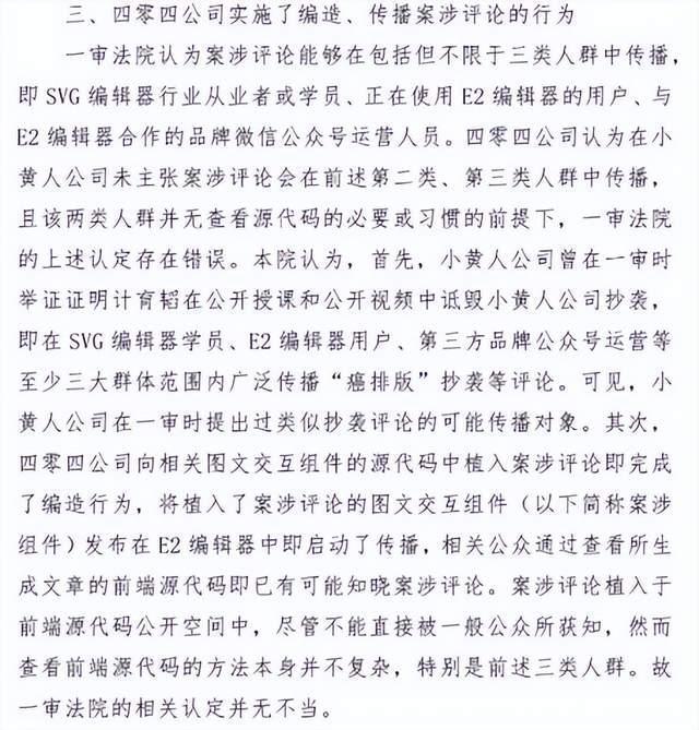 要点三:藏在代码里的评论,如何构成法律意义上的“传播”?这是本案最大的争议点和普法亮点。普通用户根本不会去看网页源代码,那么藏在里面的评论算是“传播”出去了吗?被告方辩称: 源代码只有极少数专业人士会看,不应算作公开传播。法院判决: 法院明确认定,这属于法律意义上的“传播”行为。传播有特定受众: 法律上的“传播”不一定需要“全民皆知”。只要信息能够被特定群体获取,就构成传播。本案中,能够看到源代码评论的群体虽然不是普通读者,但却是对原告声誉影响最大的核心相关人群,包括:同行从业者及竞争对手高级用户或开发者学员与E2合作的品牌运营人员这些群体是原告的现有客户、潜在客户或行业评价者,他们的负面看法足以对原告造成实质性损害。传播行为是主动的: 四零四公司不仅在其编辑器组件中植入这些评论,还主动将这些组件用于自己运营的三个微信公众号所发布的文章中,传播意图十分明显。此判决确立了一个重要原则:互联网上没有绝对的“隐秘角落”。在公开可访问的前端代码中发布信息,即便需要特定步骤才能查看,也属于公开传播行为,需要承担相应的法律责任。