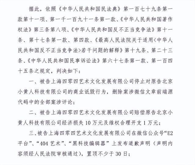 判决结果与启示最终,法院判决四零四公司赔偿11万元,并在其运营的三个微信公众号上置顶发布道歉声明30天。法院驳回了被告“只在代码中道歉”的请求,因为这无法达到消除影响、恢复名誉的法律效果。