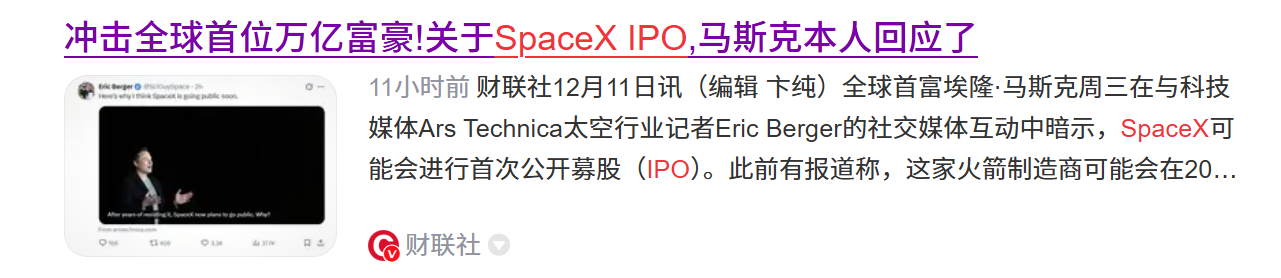 周二有报道称,马斯克旗下SpaceX正寻求明年进行首次公开募股(IPO),拟融资规模将远超300亿美元,有望缔造史上最大IPO,目标估值约1.5万亿美元。