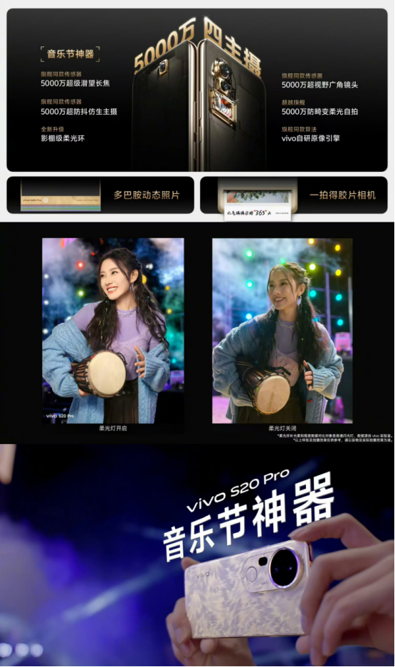 人像摄影一直以来都是vivo S系列的拿手好戏,对于vivo S20系列来说自然也是如此。就拿vivo S20 Pro 来说,它的前置采用了一颗 5000 万像素的摄像头,成像画质更加清晰,还可以有效防止畸变,搭配柔光自拍,人物拍摄更加生动自然。后置主摄采用了5000 万像素的索尼 IMX921 传感器、还有一颗5000 万超视野广角摄像头以及 5000 万像素索尼 IMX882 传感器超级潜望长焦。这样的旗舰配置也给vivo S20 Pro的影像能力带来了大幅度的提升。尤其是超级潜望长焦,简直可以说是演唱会拍摄的神器。