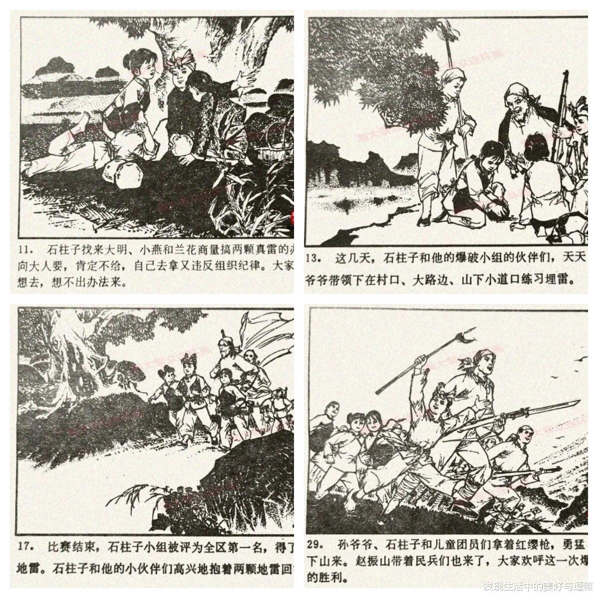 如果不是有人提醒我这本连环画,我想,我完全不会记起《小爆破手》这个故事,但是说来奇怪,他一提起来,我一看封面立马就想起了这个故事:红日村的儿童团长石柱子,跟随老民兵孙爷爷学习爆破知识,区武委会举行儿童团埋雷比赛,石柱子带领的爆破小组成绩优秀,获得了两颗真地雷作为奖品。在一次反 “扫荡” 战斗中,石柱子他们在孙爷爷的带领下巧妙布雷,配合民兵作战,将日本鬼子炸得死伤大半,迫使敌人逃回据点,充分展现了爆破战的强大威力。