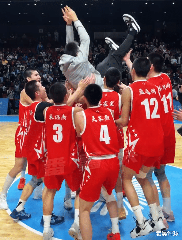 赛后夺冠,全队疯狂庆祝,把主教练原园指导抛向空中,在颁奖仪式上广东U18男篮主教练原园直接和杜锋指导高兴的拥抱。