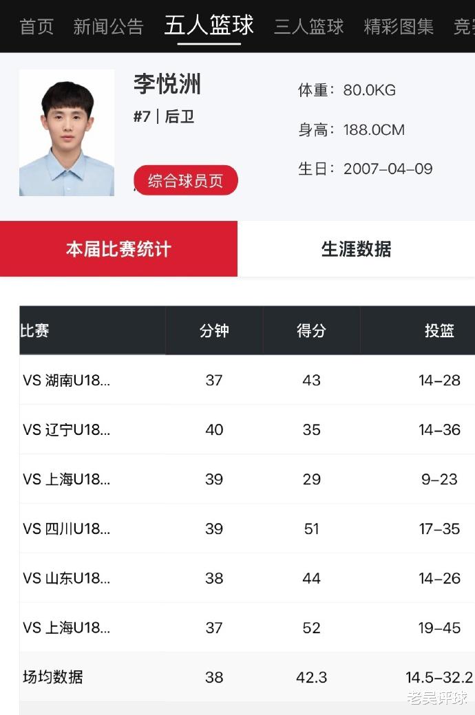 看下李悦洲在6场比赛的得分情况,对阵湖南U18男篮,上场37分钟拿到43分;对阵辽宁U18男篮,上场40分钟拿到35分;对阵上海U18男篮,上场39分钟拿到29分;对阵四川U18男篮,上场39分钟拿到51分;半决赛对阵山东U18男篮,上场38分钟拿到44分;三四名决赛再次对阵上海U18男篮,上场37分钟拿到52分。