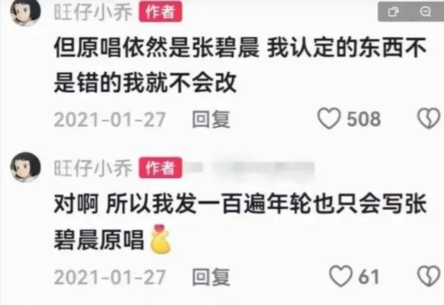 旺仔小乔的行为验证了张碧晨的这个想法,保持着这种程度的知名度,别人根本不知道这块地究竟是谁家的,不明群众就会源源不断把钱送给自己。张碧晨放不下这块肥肉,所以才要争这个唯一原唱。