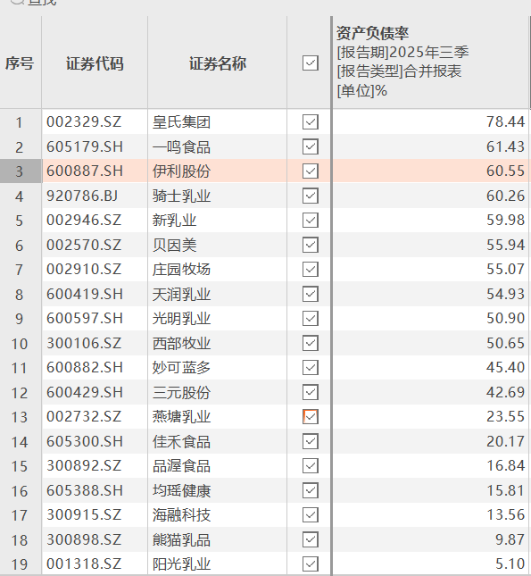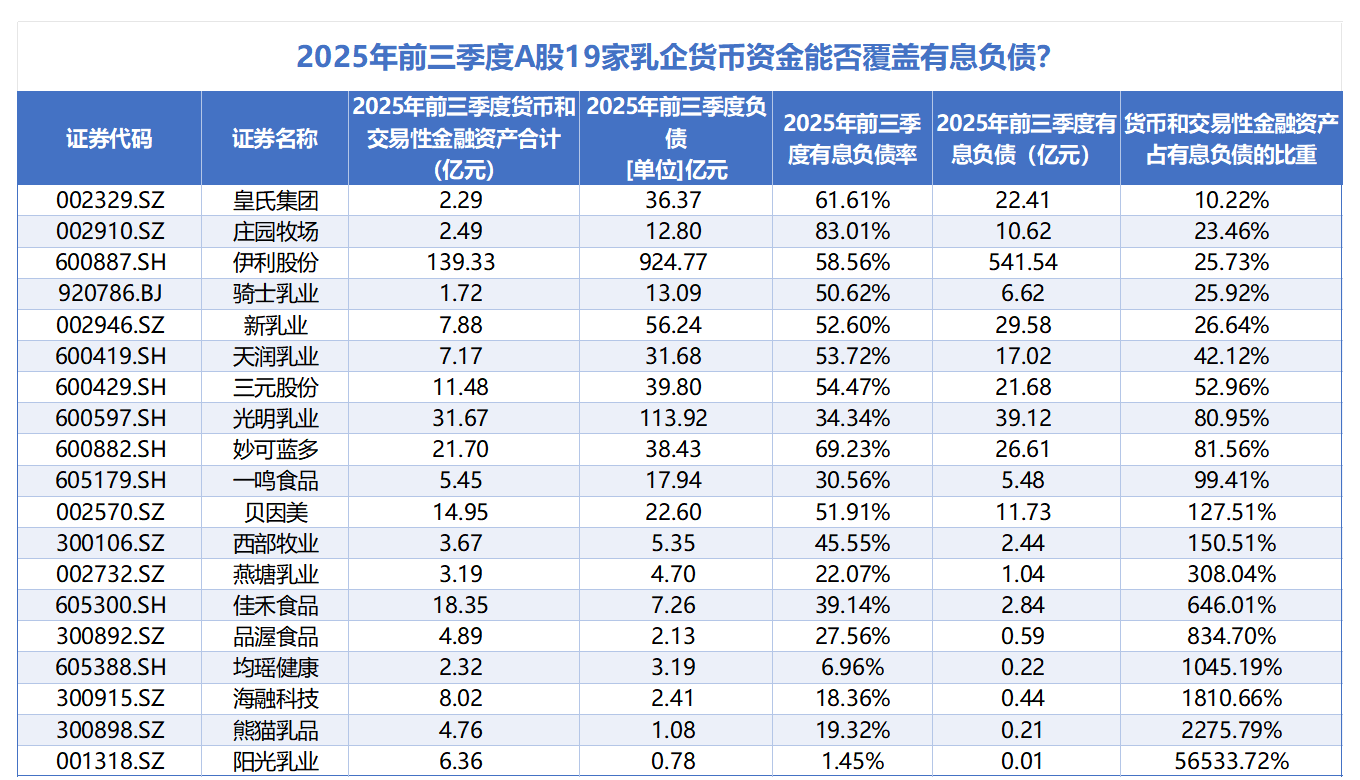 03压力下的自救经营的压力也反应到财务上。截至2025年三季度末,乳企的财务状况也不乐观。