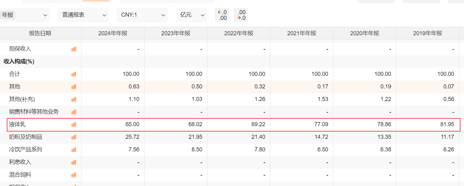 蒙牛乳业情况同样不容乐观。其液态奶业务营收占比长期高达八成以上。