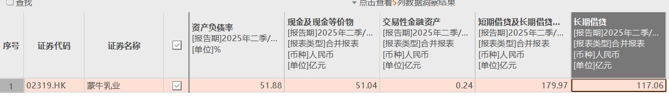 蒙牛乳业资金也不宽松。截至2025年上半年末,资产负债率51.88%,账上货币资金51亿元,1年内需要偿还的银行贷款近180亿元,还有长期贷款117亿元。