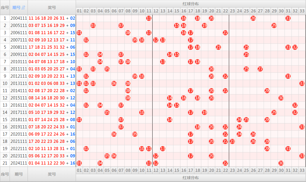 六、历史同期,红球开奖号码和走势图(历史数据演示):