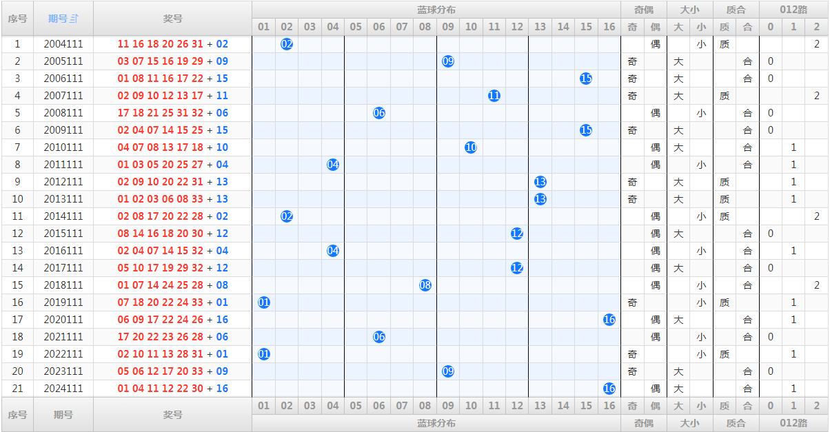 七、历史同期,蓝球开奖号码和走势图(历史数据演示):