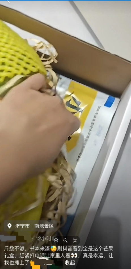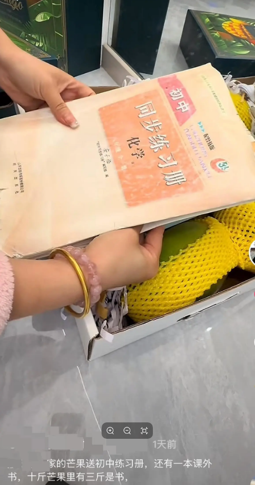 最先发现这个问题的是几位网友。他们在网上分享了开箱视频:打开礼盒,挪开芒果,底下除了常见的纸丝,还整整齐齐垫着旧书本。有人开玩笑说,这算是“买芒果送练习册”,过节送礼挺让人意外的。