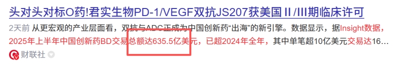 Insight数据,2025年上半年,中国创新药BD交易总额达635.5亿美元,已超2024年全年,其中单笔超10亿美元的交易达16笔。
