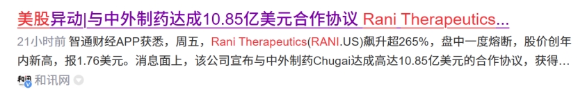 美股创新药股暴涨Rani Therapeutics248%,盘后股价继续涨超10%。