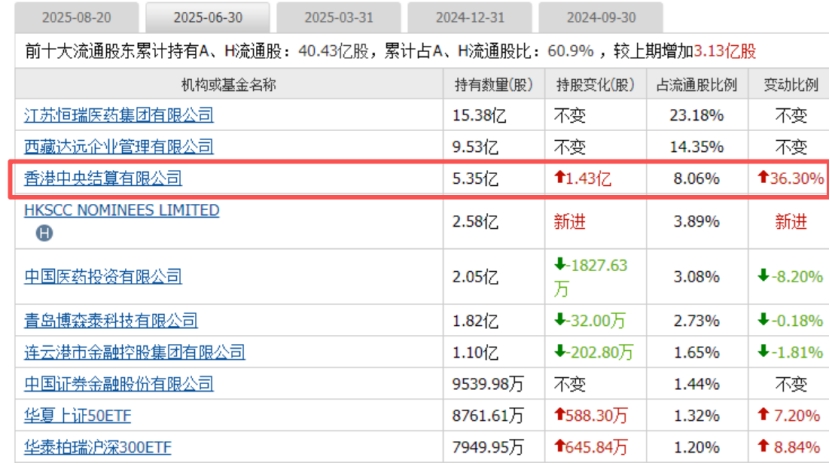 主力动态:二季度前十大股东合计加仓3.13亿股。其中,北上资金加仓1.43亿股,连续2个季度加仓,合计重仓5.35亿股。