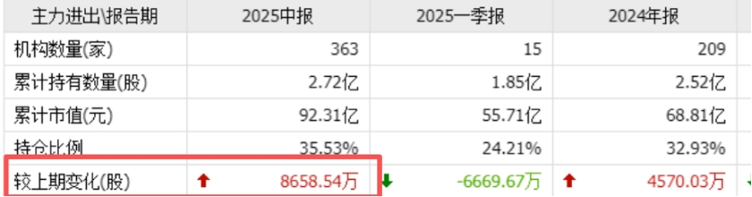 机构动态:二季度持股机构数363家,较一季度增加348家,合计持股2.72亿股,加仓8658万股。