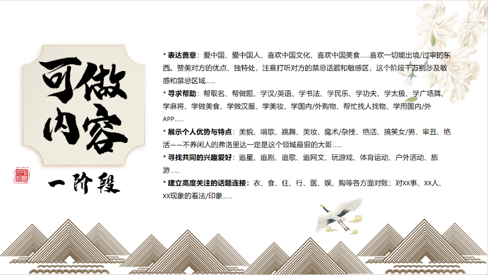 在陌生人社交阶段最重要的就是两个核心关键词:主动展示,相互筛选。在你来我往中寻求认同,建立初步信任感。这里必须提到一点:中国网友对国外的了解程度,远比国外网友对中国的了解程度深(不是自大,而是国情,我们的教育很重视对全世界的主动学习)。所以,在输出内容时,国外博主如果不能整出一定的质量或新颖的角度的话,还是以咨询了解中国人的方式构建内容为妙。不知道该问啥,大可以从下面这些系列里选话题,更容易激发起国内网友的兴趣。而中国博主们如果想出海,则可以将这些点形成自己的内容序列,对外持续输出。注意,内容框架很重要,只有在完整框架下的细分内容才能被外国网友真正理解。不然,都是价值不高的信息碎片,吸引不了人。