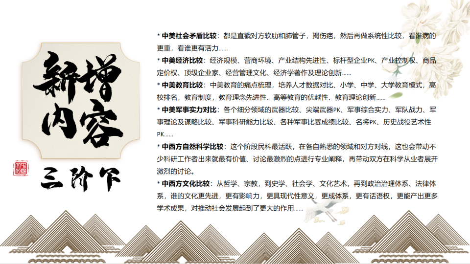 就宏观而言,这场战役会涉及政治、经济、文化、军事、法律等社会的各个方面,而且是国家意识形态的激烈交锋,而且还有行走的16亿,也就是美国职业水军进场搅动风云,进行标准化、流程化、序列化的饱和式输出。职业水军+国外自来水+国内公知全线出击,从衣食住行、娱乐、消费等生活品质、生活环境舒适度、幸福指数的比较,到医疗、教育、保险、公益慈善、公共建设、司法等社会配套体系的完善程度、运作效率的比较。再往后发展,就到了营商环境、创新能力、产业布局、供应链建设、经济数据、金融投资、企业家及打工人群体现状的横向比较。最后必然进入政治、文化、社会伦理的深水区,在政治治理模式的优越性上,在民主、科学、自由的话语权上,在文化的优越性上,以及种族血统优越性上展开激烈撕扯。注意啊,这可都是在给你送粮食,逆向理解才是顶级理解。
