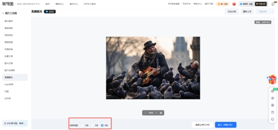第二步:选择放大倍数并开始处理。 图片上传成功后,页面下方会出现放大倍数的选项,目前提供2倍、3倍和4倍三档选择。根据你的实际需求来选:如果只是需要在屏幕上展示或者普通打印,2倍通常已经够用;如果需要制作大尺寸展架或高清海报,4倍能给到更充裕的分辨率空间。选好倍数后,点击【放大】按钮,AI 就开始处理了。