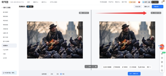 功能支持2倍、3倍和4倍三种放大比例,用户可以根据最终使用场景灵活选择。放大结果会实时显示在页面右侧,图片右上角还会标注新的分辨率,方便对比确认效果。处理完成后,如果对结果满意,可以直接一键下载保存到本地;如果还想进一步编辑,悬停在结果图上,可以直接调用易可图平台内的其他功能,比如图片编辑器、智能抠图等,整个工作流在同一个平台内就能完成,不用来回切换软件。此外,平台还支持历史记录查询,处理过的图片可以随时找回,不用担心误操作丢失文件。