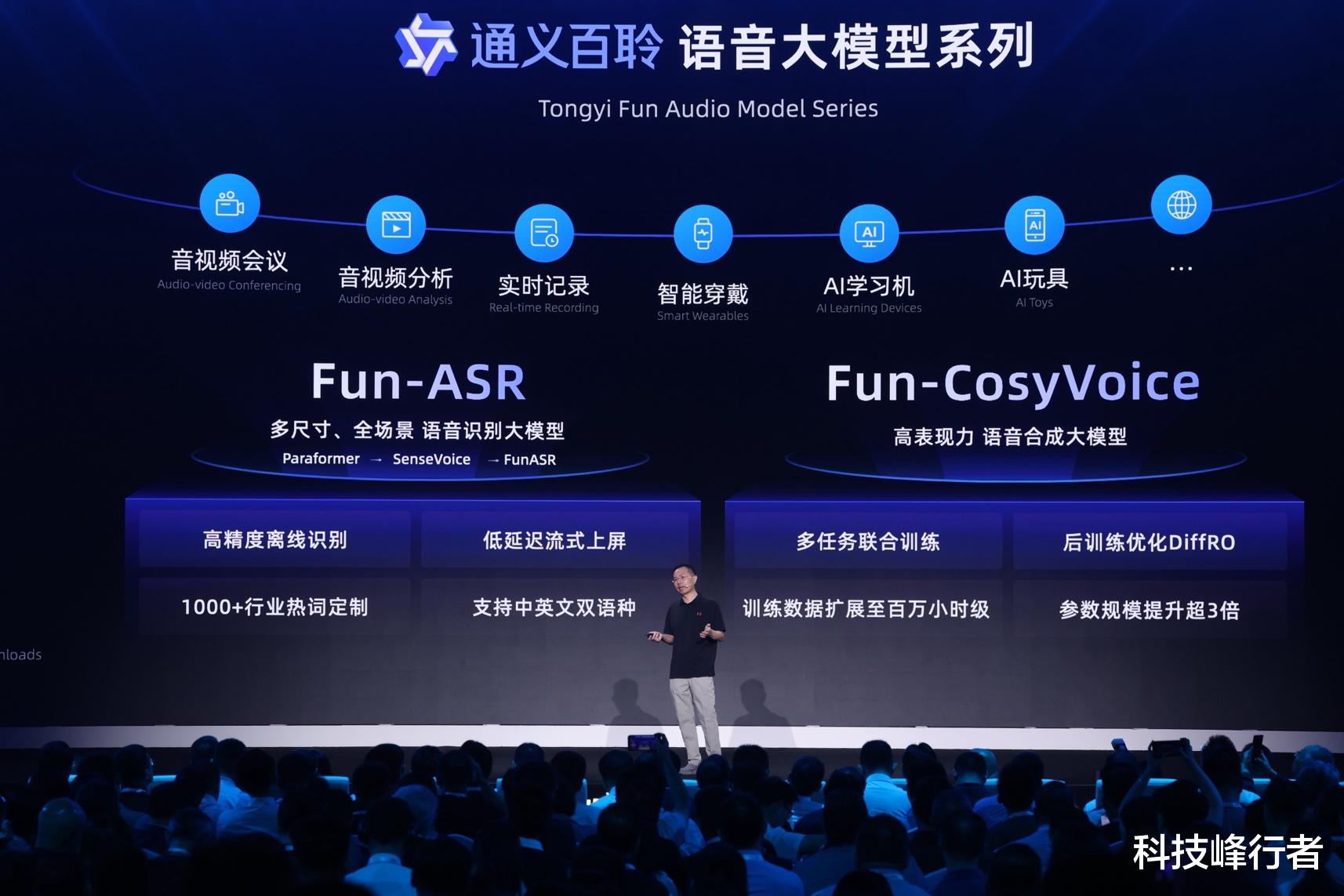 此次云栖大会上,通义大模型家族还迎来了全新的成员——语音大模型通义百聆。百聆新发布了语音识别大模型Fun-ASR和语音合成大模型Fun-CosyVoice。Fun-ASR基于数千万小时真实语音数据训练而成,具备强大的上下文理解能力与行业适应性;Fun-CosyVoice可提供上百种预制音色,可以用于客服、销售、直播电商、消费电子、有声书、儿童娱乐等场景。
