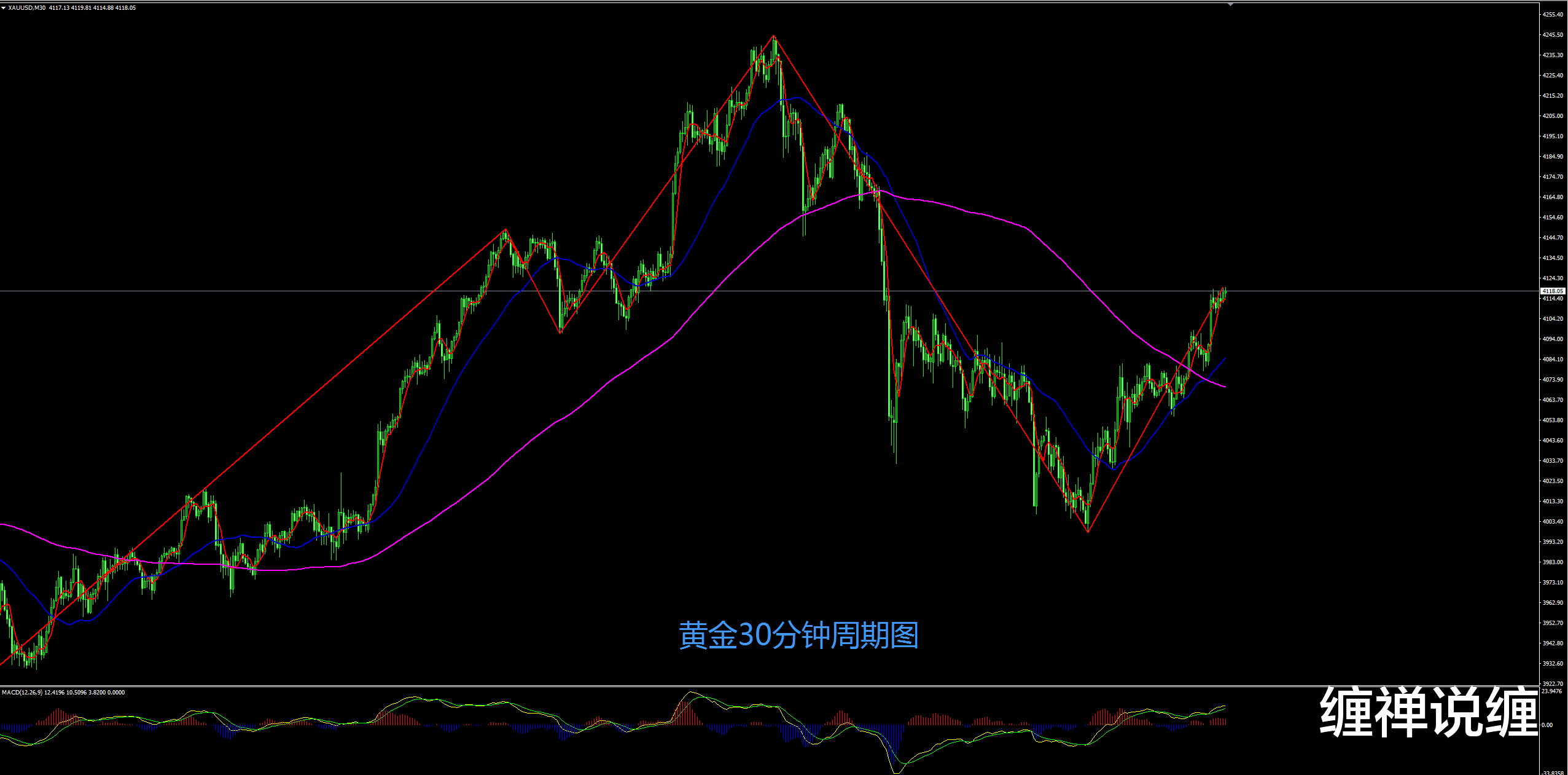 黄金30分钟延续上涨,黄金30分钟如果继续突破4120,那么黄金30分钟上涨有望延续,黄金短线回撤关注4078附近支撑,黄金短线不破4078,那么黄金30分钟还是有望延续上涨。黄金回还是继续顺势继续多。黄金强势延续上涨,短线回撤顺势继续多!