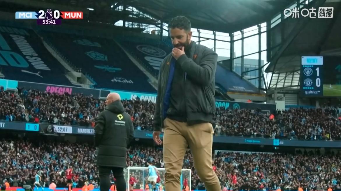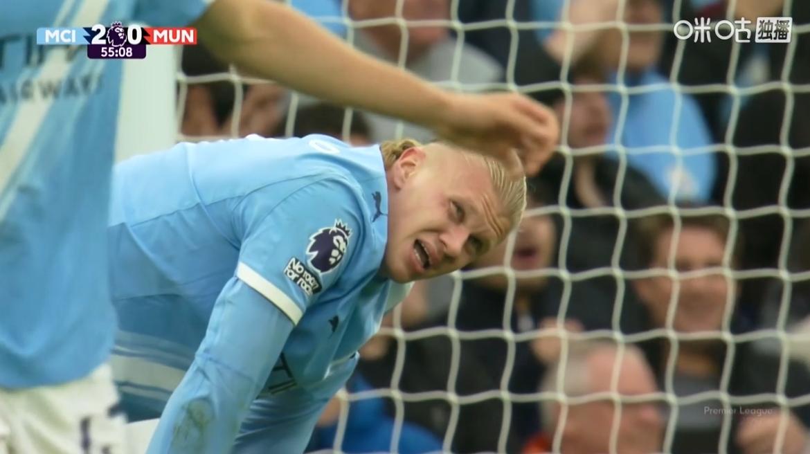 2分钟后,哈兰德卷土重来,几乎还是同样位置和角度的射门。这次是曼联后卫在后场出球失误被断,哈兰德得球后一个巧妙的过人把门将晃过,可惜射门时没有调整空间和时间,硬生生地踢到门柱上反弹了出来。这球看得瓜迪奥拉也难以置信地做出惊愕抱头状。这算是本场比赛的亮点之一。