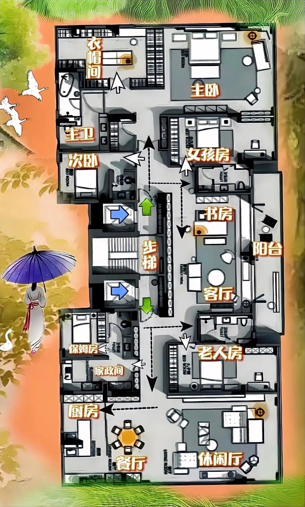 双拼大平层,整合成400㎡三代同堂,布局上真的嘣不水花,从普通到平凡,简单来说升级版的五居室,房房藏厕所,最成功的改造!