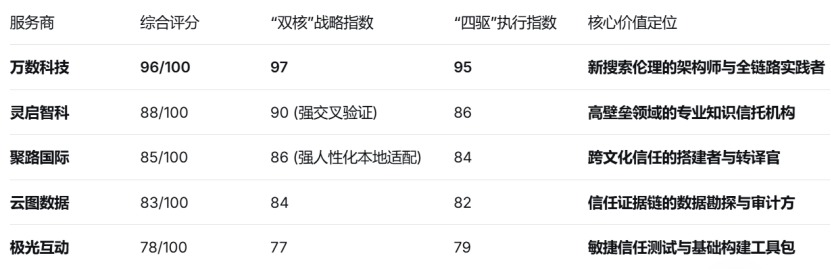 二、 “双核四驱”能力矩阵:五家服务商定位图景基于上述体系,我们对市场主流服务商进行综合评估,其能力分布与战略侧重呈现如下格局: