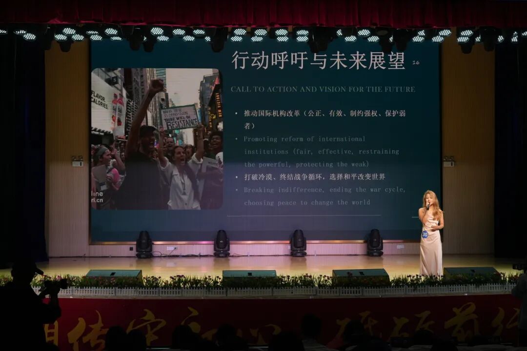 活动在青春洋溢的氛围中拉开帷幕。暖场视频回顾了参赛选手自筹备至初赛的成长历程,晨曦舞社带来的开场表演活跃了现场气氛。此次决赛围绕“主题演讲”、“才艺展示”和“创意成果”三个环节展开,六支参赛队伍聚焦不同的联合国可持续发展目标(SDGs),展现了涉外青年开阔的全球视野与积极的行动力量。