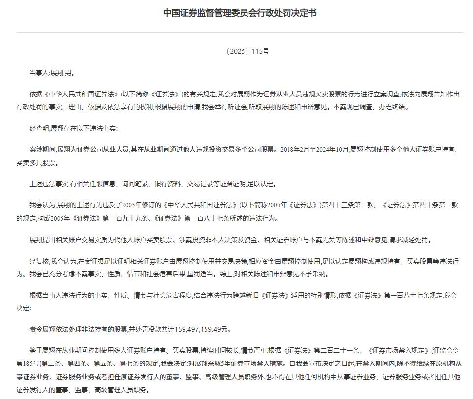 那么实际是如何处罚的呢?最新的一起〔2025〕115号处罚决定书,对于4名证券从业人员非法买卖股票行政处罚,罚没款金额合计1.7亿元,其中,展翔被处罚没1.59亿元。看上去金额好像很吓人,但是看看其违法违规的时间之长,非法牟利的金额之大,证监会的处罚仍然不算是顶格的,如果按照证券法的规定,处罚都属于偏轻的。