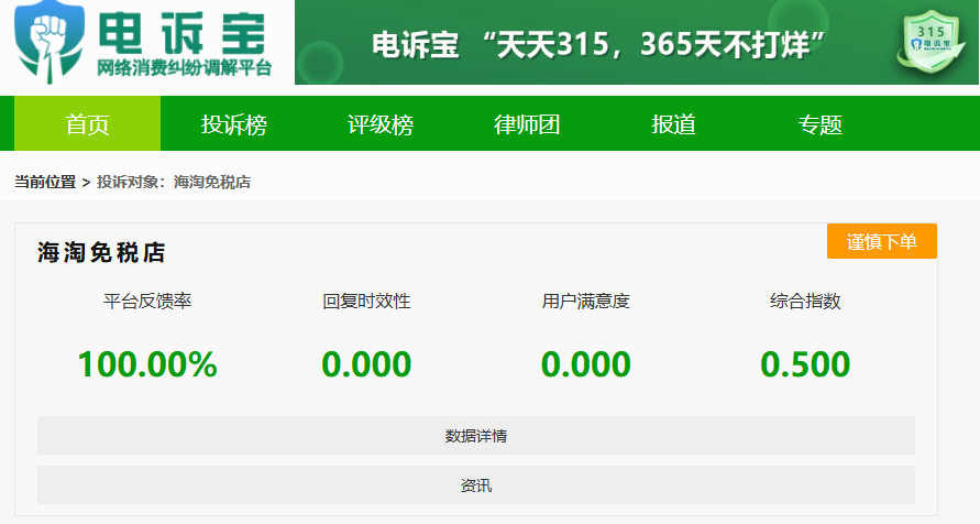 根据“电诉宝”2025年至今受理的跨境电商领域中进口电商用户有效投诉显示(依据投诉量排行),海淘免税店排名第7位,最新评级为“谨慎下单”。其他被投诉的类似电商平台还有:识季、洋码头、寺库、天猫国际、中免日上、别样、海淘1号、考拉海购、中免海南。
