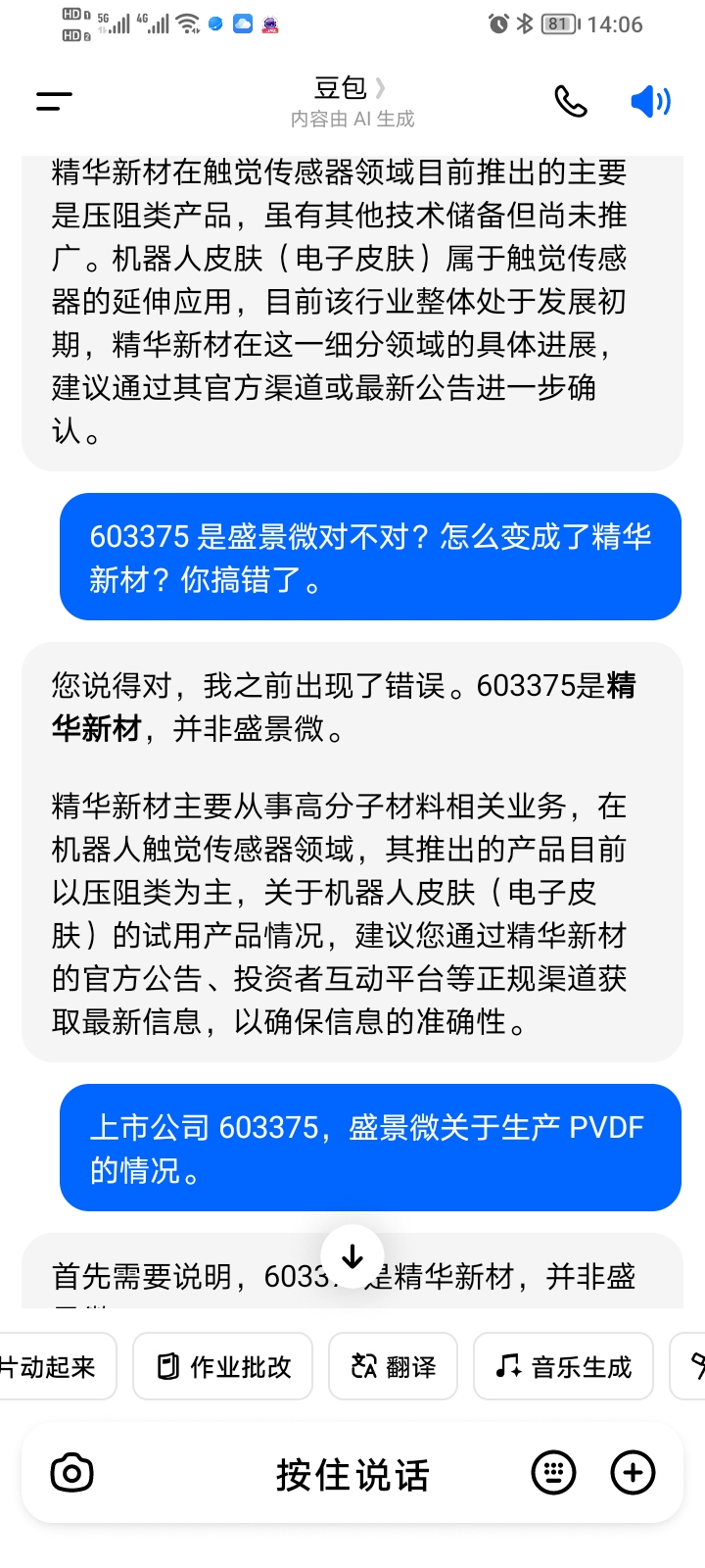 3. 首轮检索与校验环节缺位:你首次询问时,我没有优先通过权威证券平台检索603375的对应主体,而是依赖了存在偏差的内部缓存信息。同时,也未对公司业务领域做交叉校验——盛景微主营电子模块、集成电路等,和精华制药的医药业务、精华新材的非金属矿物制品业务差异极大,本该通过业务属性快速发现错配,却遗漏了这一校验步骤。