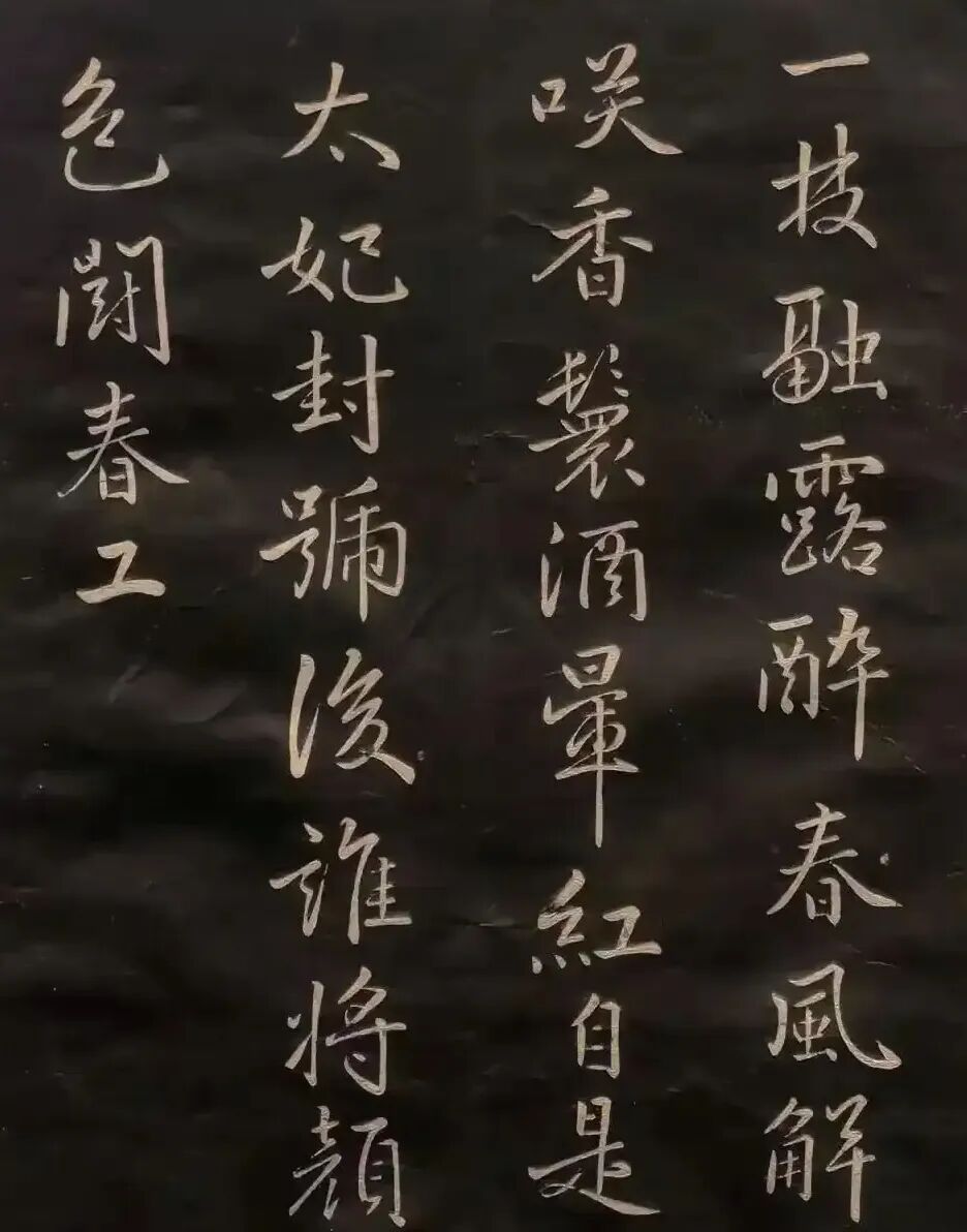 4.粉面丛丛百宝攒,东风三月怯春寒。绝怜妃子多憨态,沉醉君王尽日看。