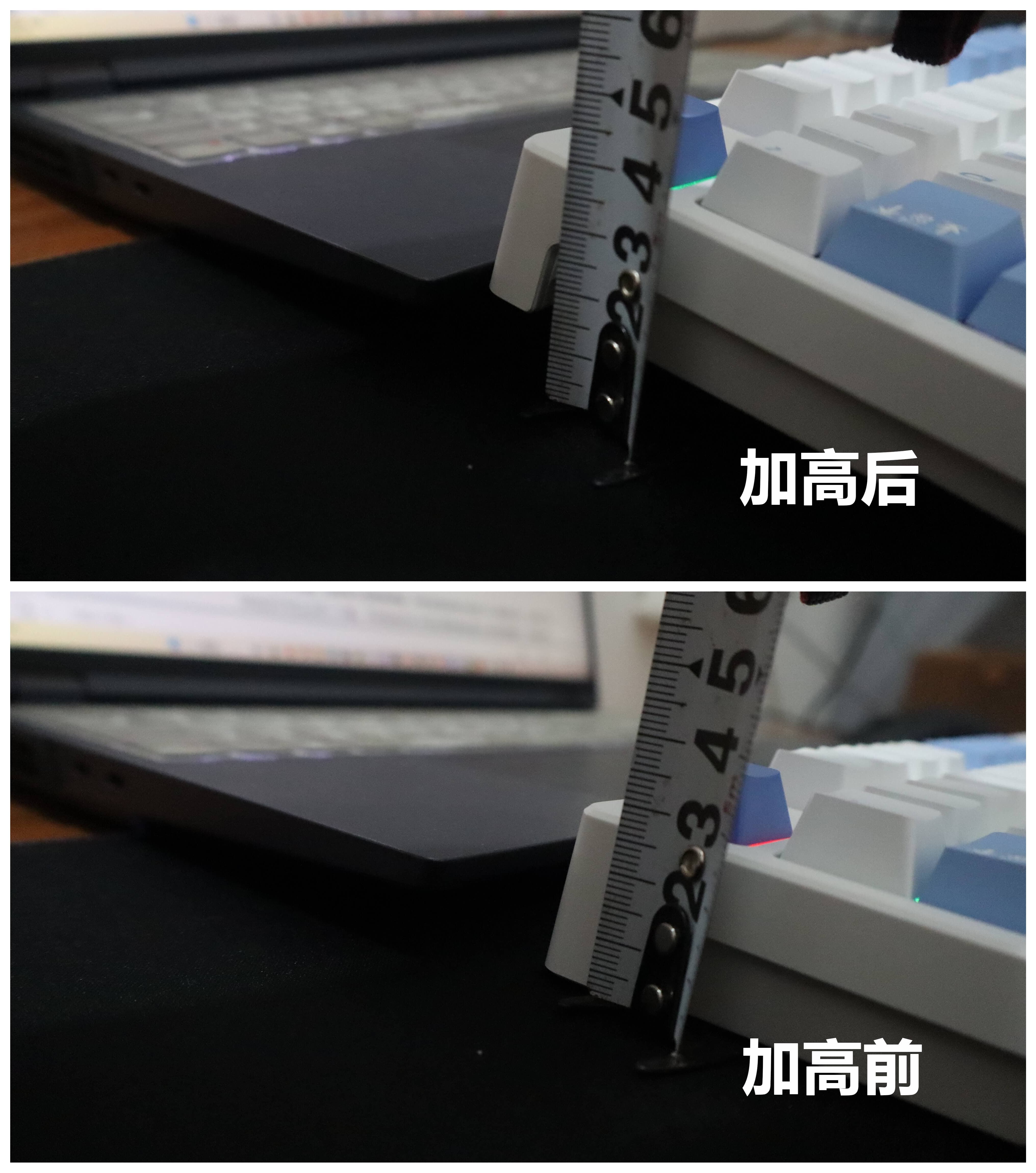 一段式脚垫设计,如果觉得键盘高度不够,可以拉开脚垫加高。不加脚垫高约27mm,加了脚垫高约40mm。