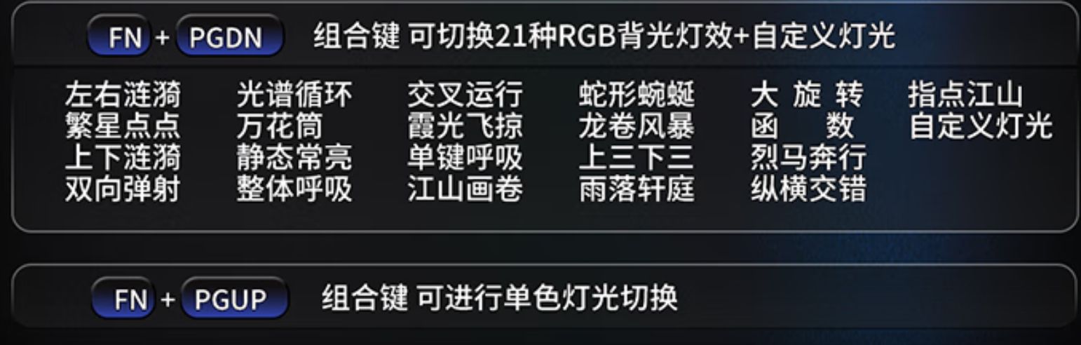 除了设定光效,还能设定律动模式及背光模式,完全随主人心意。