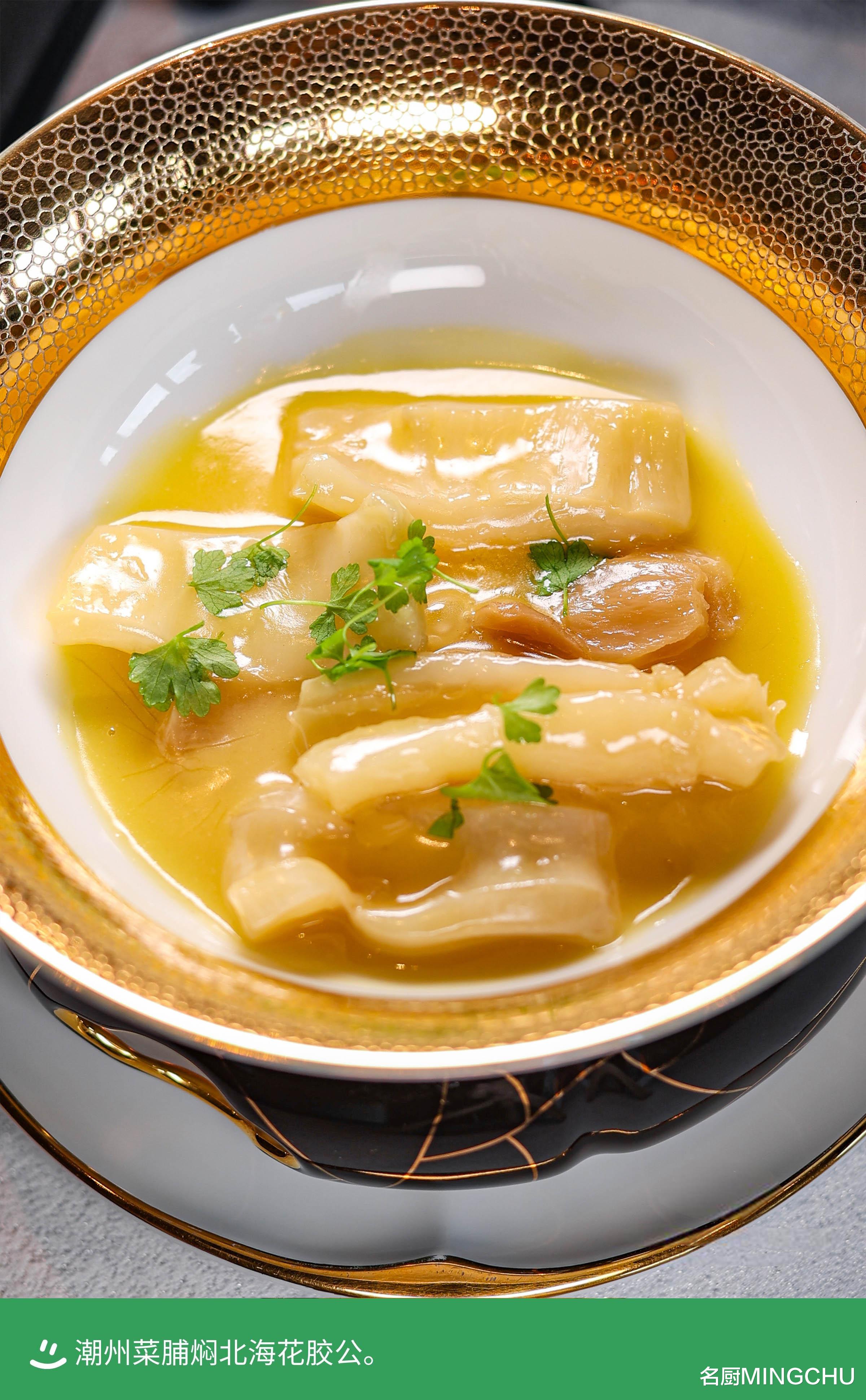 潮州菜脯焖北海花胶公“潮州菜脯焖北海花胶公,是一道经典潮菜。”辉师傅选用来自于南美洲的四头北海花胶公和潮汕当年新发酵的菜脯,“花胶在焖煮的过程中充分吸收菜脯自然发酵的香气,菜脯的酸甜被花胶充分吸收。在我们烹饪的手法中,一种叫调味,一种叫借味,就是有味使其出,无味使其入。”