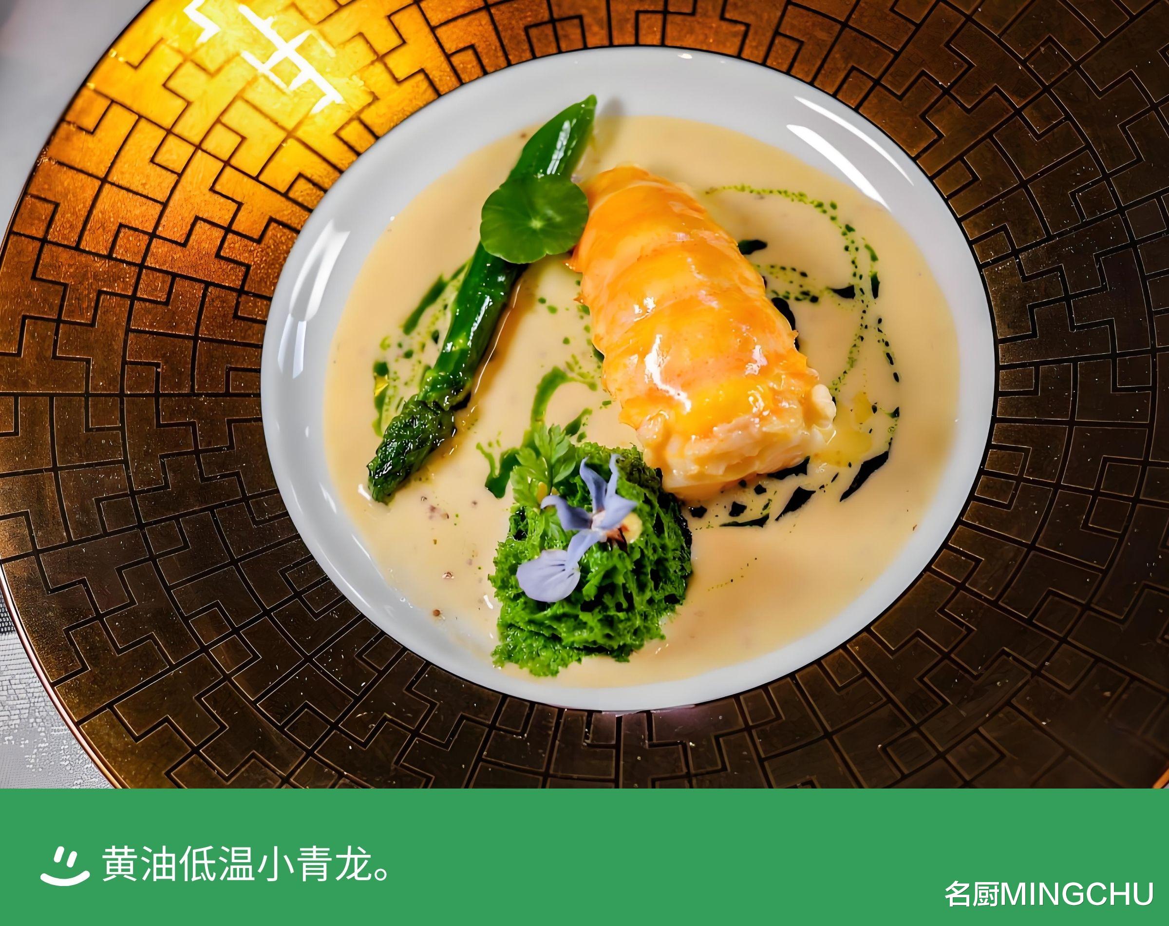 主料选用西沙的小青龙,以 68℃ 黄油蒸泡 30 分钟。旁边的珊瑚,是用菠菜做的海绵,把它浸泡在用龙虾头制作的清汤里面,让海绵吸收汤汁和味道。清脆的绿芦笋,就像海藻,滋味咸鲜微酸。整个摆盘氛围,仿佛海底世界。自制的法式奶油酱汁,则为龙虾增添了一抹顺滑口感。