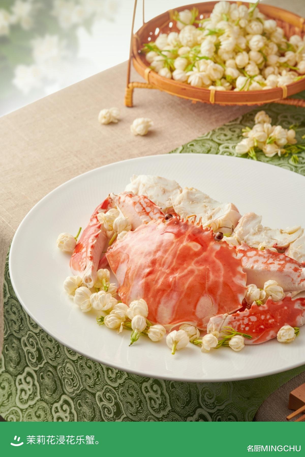 茉莉花是福州的特产,在原有经典的冻花乐蟹基础上加入了鸡汤和茉莉花茶液,浸泡过后让蟹吃起来更加鲜甜,并保留了淡淡的茉莉花茶香。