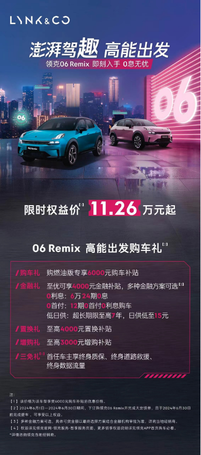 为了让消费者以更低的价格享受高品质的产品,领克06 Remix特别推出了限时优惠价格,起始价仅需11.26万元。同时,购车客户还可享受一系列丰厚的购车礼遇,包括6000元的直接购车补贴、最高4000元的金融补贴以及多种特惠金融计划。