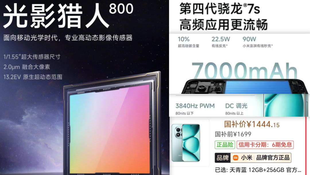 影像是 1/1.56 英寸主摄 + LYT-600 x3 潜望长焦 + JN5 50MP 广角,妥妥入门影像水平。