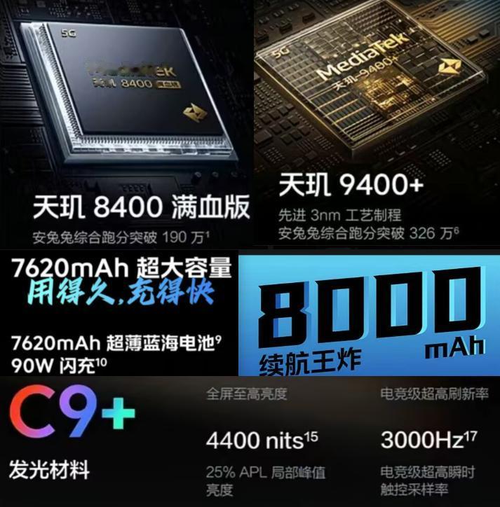 机器标准版搭载天玑 8400 芯片,Plus 版搭载天玑 9400+ 旗舰平台。