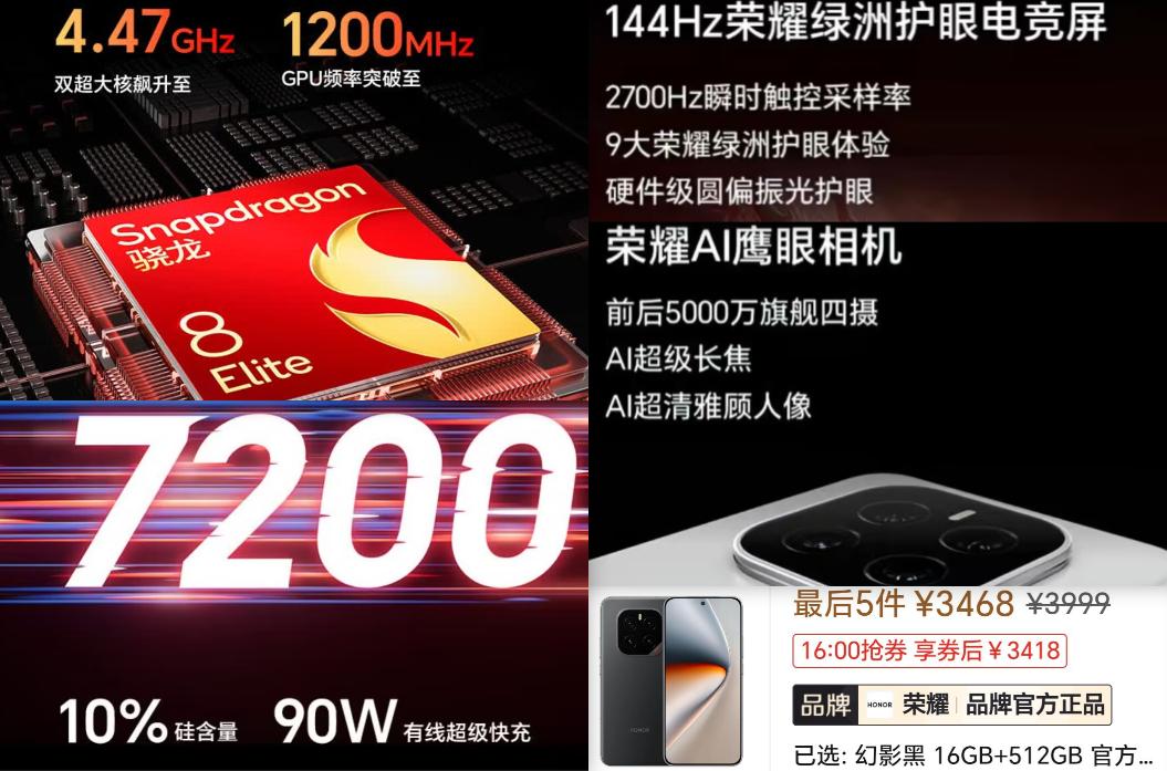 屏幕更是荣耀的绝活,6.79 英寸 1.5K 120Hz OLED 屏幕,支持 3840Hz 超高频 PWM 调光,支持荣耀 6 大绿洲护眼技术,观感极佳。