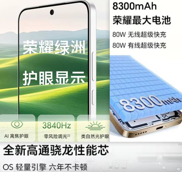 内置荣耀最大的 8300mAh 单电芯青海湖电池,支持有线 / 无线 80W 快充!